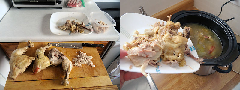 I took the chicken out and put the remaining pot contents in a 5 quart slow cooker set on low. I put a couple of chicken bones I had trimmed from a prior cook and frozen. I just wanted to use them up, you don’t need to have extra bones to make this recipe.