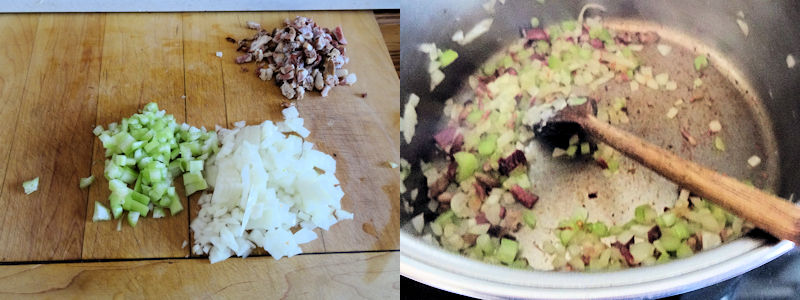 - Add the diced onion, celery and bacon. Sauté until the vegetables are soft and there are brown bits on the bottom of the pot, about 5 minutes.