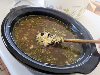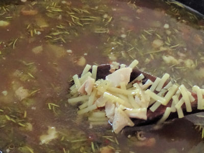 I added enough water to make 4 quarts and brought the pot to a boil. I reduced the heat and simmered for 20 minutes. I added the chopped chicken and simmered for 10 minutes more.
