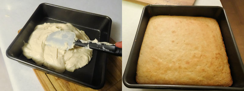- Put the batter in a 9 inch square pan that has been sprayed with baking spray.