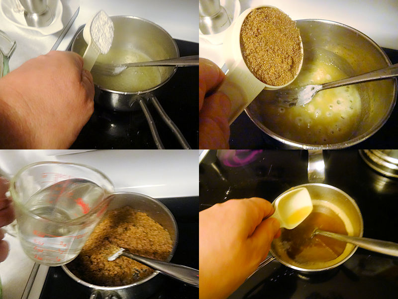 Melt the butter over medium high heat. Add the flour and stir until mixed. Add the brown sugar and salt. stir to combine. Add the boiling water and stir to dissolve the sugar. Add the brandy and vanilla and remove from the heat.