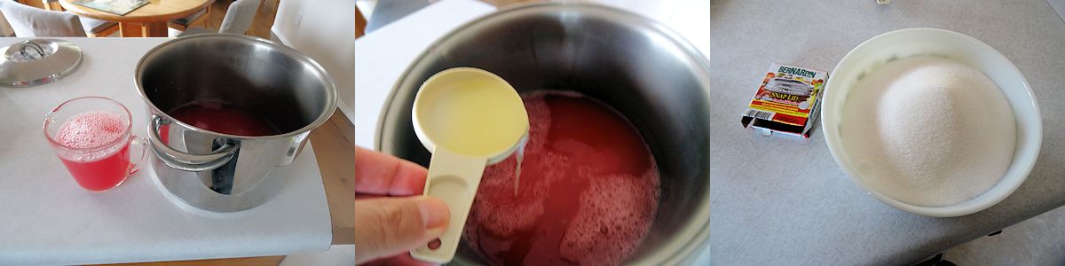 Put the juice in a large stainless steel or enameled pot (the jelly will boil up a lot). Bring the juice to a boil. Add the sugar and stir it in. Bring the mixture back to a full boil.