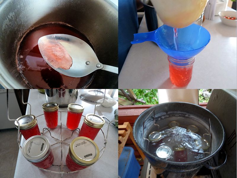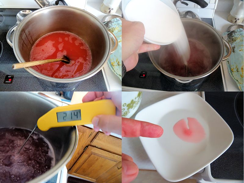 I like to make sure the jelly has reached a soft gel stage and keep a plate in the freezer. When the jelly reaches temperature, I turn the heat to medium low and put a spoonful of jelly on the plate. I put it back in the fridge for a moment. I take it out and pull my finger tip through the jelly. If it doesn’t flow together, it is done.
