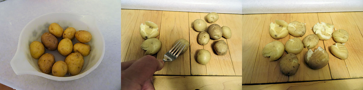 I started by putting the potatoes in a microwave safe casserole and adding 1/2 cup of water. I microwaved them for 5 minutes, turned them and microwaved them for 5 minutes more. I did a fork test. You want them to be just tender. Overcooked will not work well.