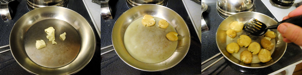 I heated 50 ml (1/4 cup) of margarine or butter in an oven safe fry pan over medium heat. As soon as the butter is melted, put the potatoes in butter and turn them over to coat them. Put the fry pan of potatoes in the oven.