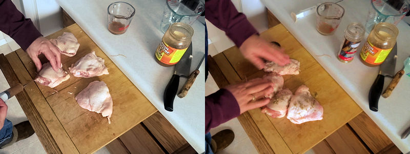 - Work a finger under the skin of the thighs and rub the remaining seasoning under the skin.