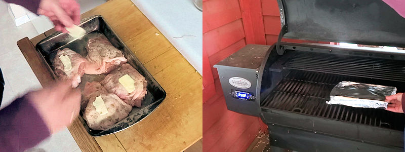 I worked a finger under the skin of the chicken and rubbed more of the seasoning mix under it. Then I put the chicken in a roasting pan and put any left over marinade over them. I put a pat of butter on each thigh. I covered the pan with foil and put it in a 250 F smoker for 40 minutes.