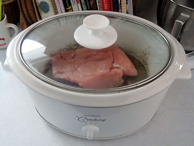 I started by putting some onion chunks, carrot chunks and garlic cloves in the bottom of the  slow cooker. I put chicken broth and herbs on top of them and the turkey breast on top of that.