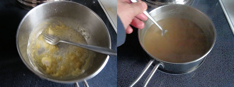 I strained the juice and defatted it. If there   is less than 500 ml (2 cups) of juice, add chicken stock to make 2 cups.