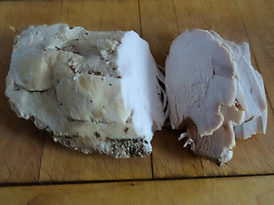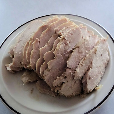 She Who Must Be Obeyed came home with a 1 kilogram (2 pound) boneless, skinless turkey breast. This particular cut of meat is tough to cook. If you dry roast it, it gets an unpleasant dry surface and the meat can get tough.