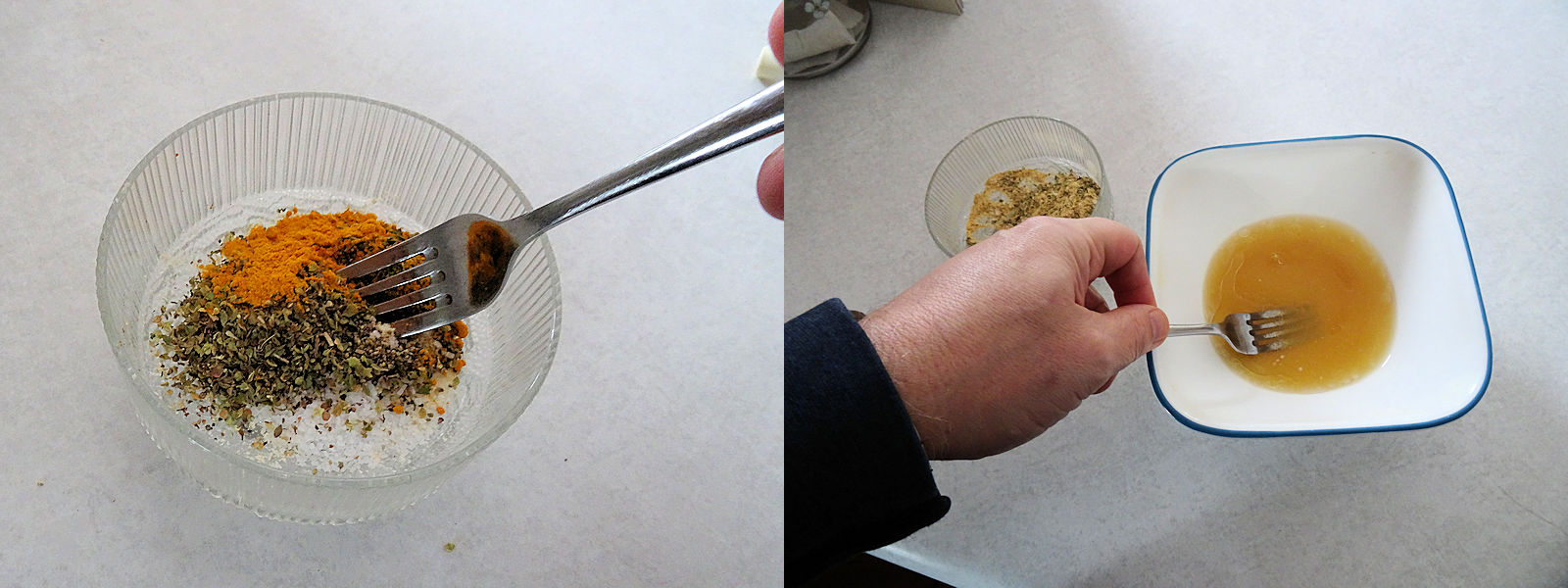 Work your finger under the skin of one of the thighs and work 1 ml (1/4 tsp) (0.8 gm) of the seasoning under the skin and repeat with the other thigh.