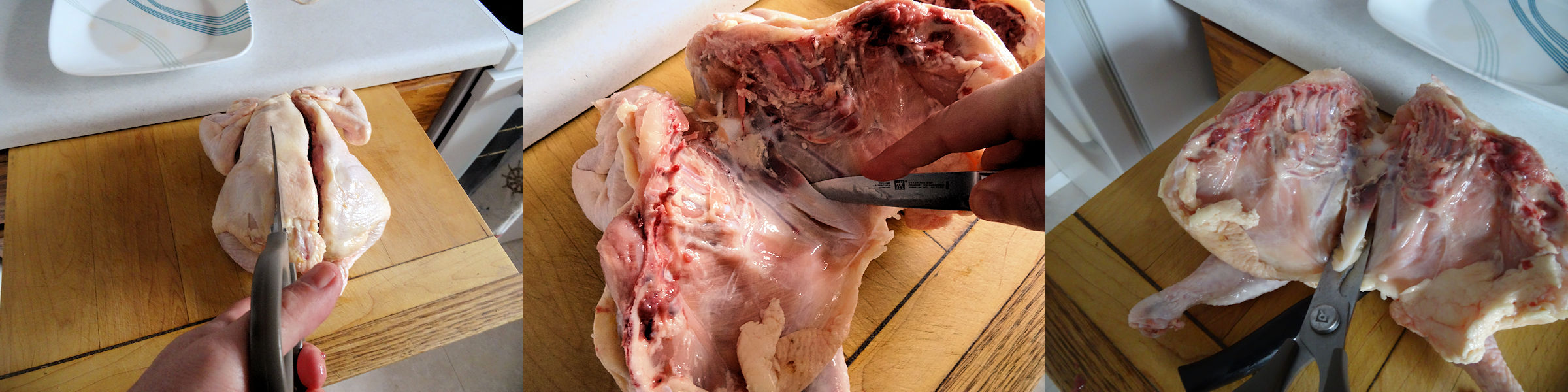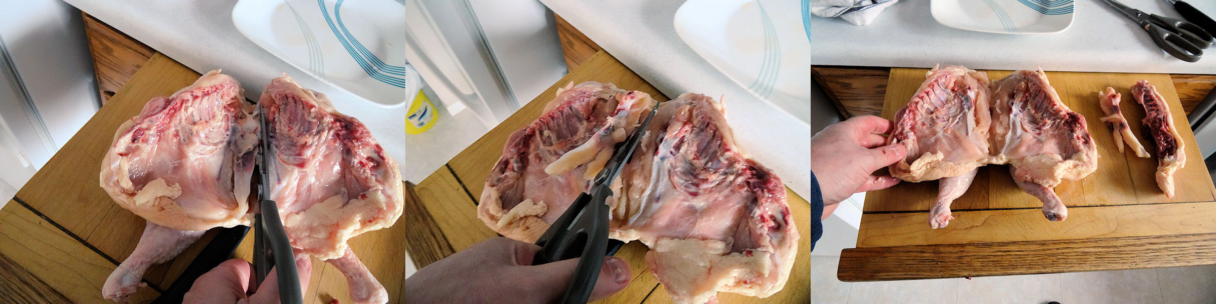 You start by cutting with poultry shears down both sides of the backbone and removing it.