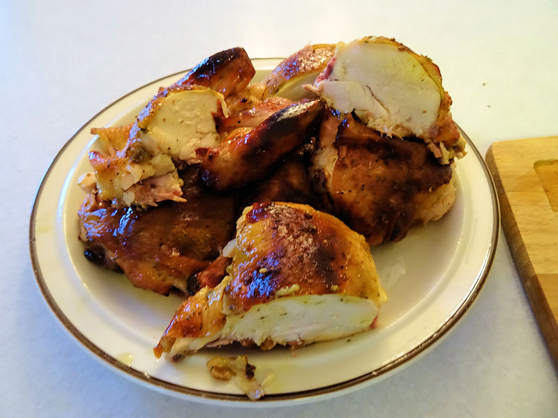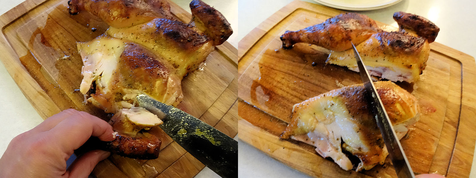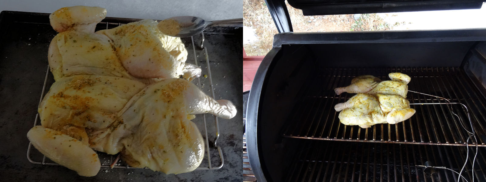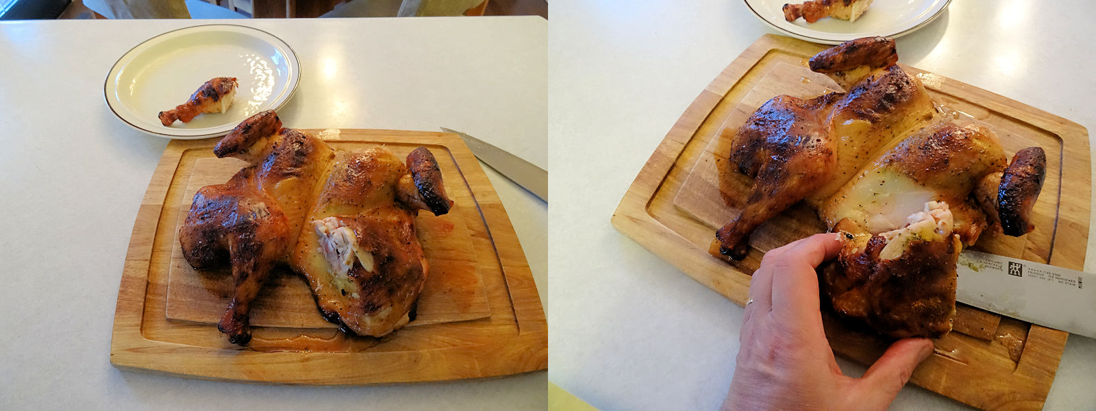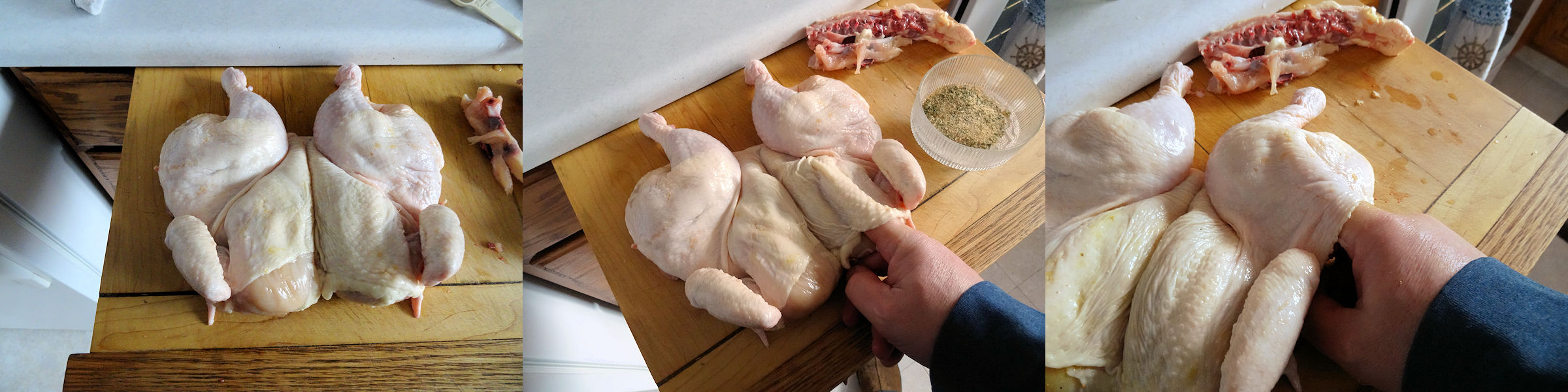 I spatchcocked a 1 kilogram (2.2 pound) chicken. This is a process of cutting the back and chest bones out so the chicken will lay flat on a grill.