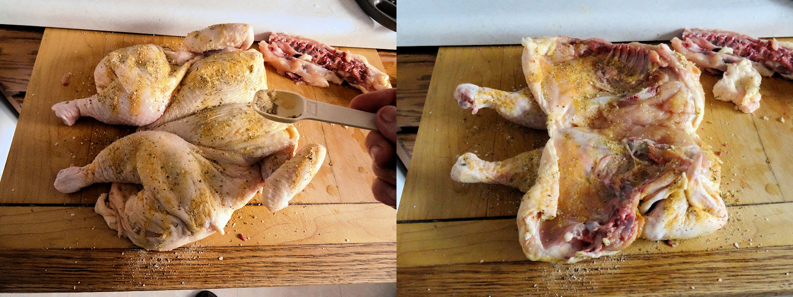 Sprinkle 4 ml (3/4 tsp) (3.2 gm) of the seasoning over the skin. Turn the chicken over and sprinkle 4 ml (3/4 tsp) (3.2 gm) of the seasoning over the bone side of the chicken.