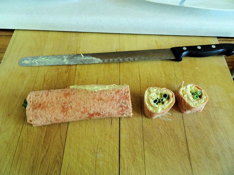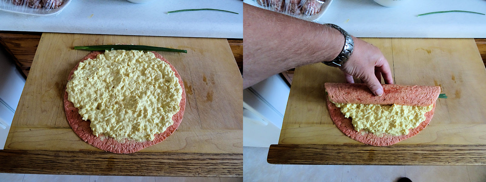 - Put a green onion across the top of the tortilla. Roll the tortilla around the green onion jelly roll style.