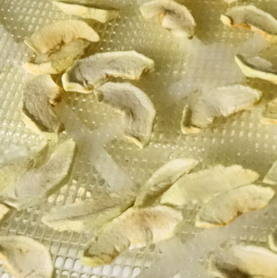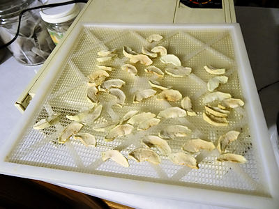 How long it will take depends on the efficiency of your dehydrator and the moisture content of the apples you are using. I start checking at 4 hours and they are all usually done by 7 hours. I rotate the shelves and flip the apples every 2 or 3 hours. You can tell a piece is done if it is leathery and doesn’t feel spongy in the centre. Bite into a couple you think are ready. If the centre is soft but not damp, that is what it should feel like
