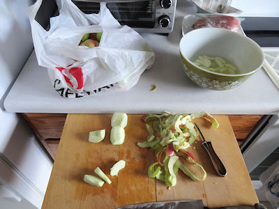 You start by coring and peeling the apples. Strictly speaking, you don’t have to peel the apples. I have done it without peeling and it turns out fine. However, I think they dry faster and look better if you peel them