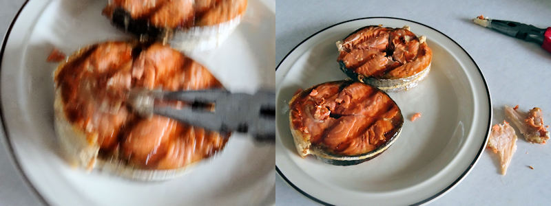When the salmon had reached an internal temperature of 140 F (about 30 minutes), I took it inside. I used a clean pair of needle nose pliers and grasped the spinal bone and wiggled until it pulled out taking the remaining bones with it.