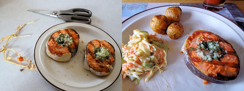 She Who Must Be Obeyed was happy which means I was happy. The salmon had a nice hint of smoke, the butter gave a good kick of dill and garlic. I think you will like this.