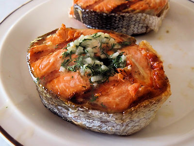 We purchased two salmon steaks and I was charged with preparing it. I love dill and garlic on my salmon so I made Dilled Salmon Steaks.