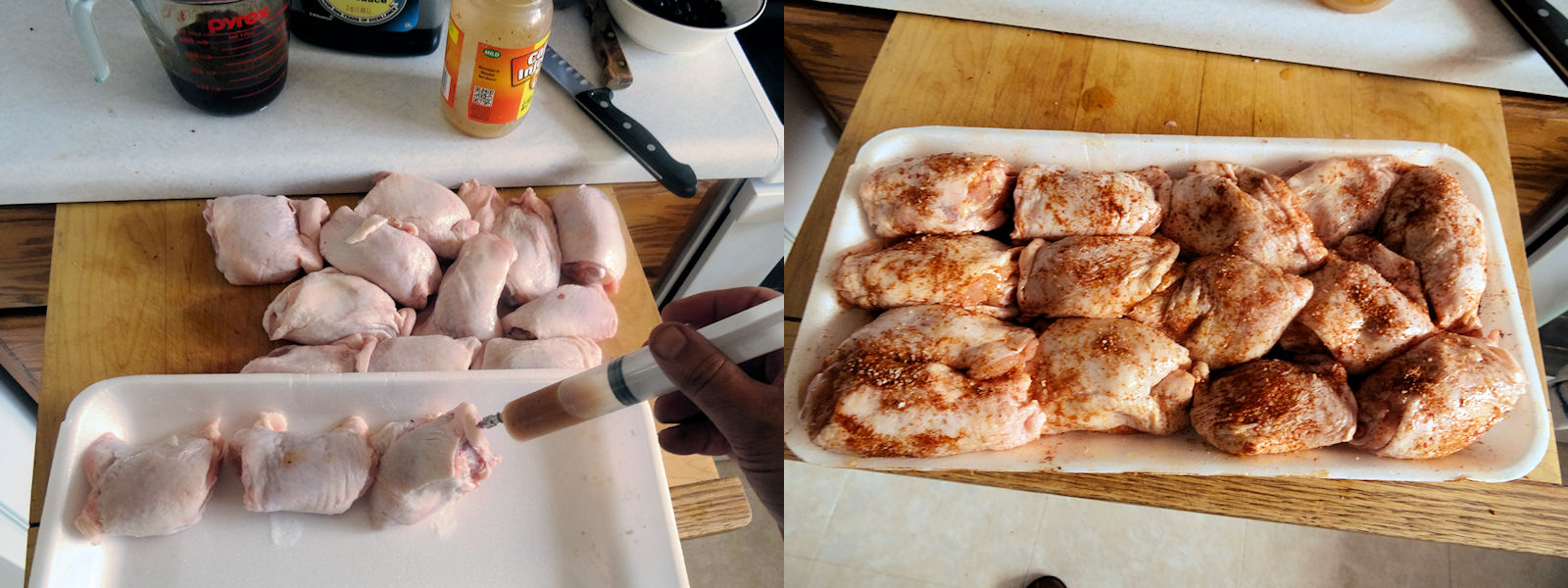 I injected 12 thighs with 50 ml (1/4 cup) Cajun Injector Creole Butter. This is optional but does add a bit of flavour kick.