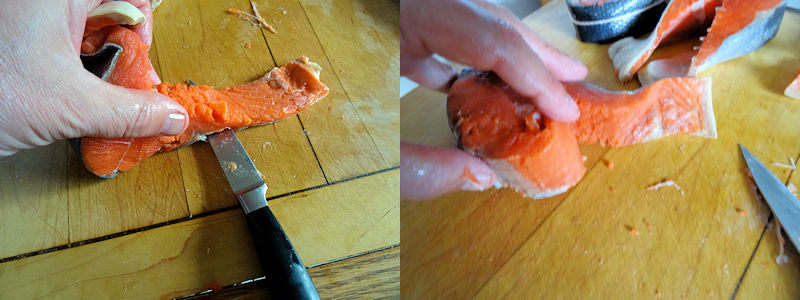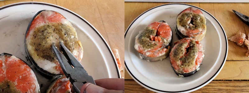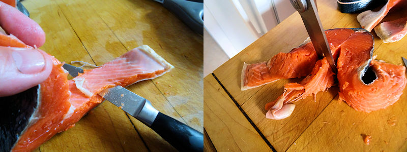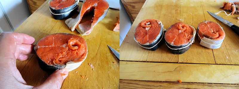 She Who Must Be Obeyed and I both like a nice piece of wild salmon despite it costing more than ice in the dessert. So, when some wild sockeye steaks were put on sale, we bought them. The problem with salmon steaks are they have bones and the thin belly pieces are hard to eat between the bones and the skin.