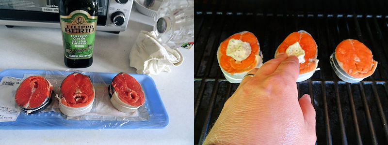 Rub the salmon with olive oil. Put it in the smoker or oven and put a disc of herb butter on each salmon steak.