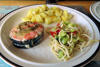 This was a real treat. There was practically no bones in the salmon and it was easy to eat. The herb butter really enhanced the salmon taste without overpowering it. The salmon was moist and tender. It also looks, well, fancy shmancy.
