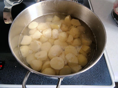 I started by peeling and cutting the potatoes into chunks then boiling them in salted water until soft. That should take about 20 minutes or more depending on your altitude.