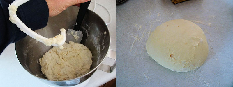 I put the bowl on the stand mixer with a dough hook and turned it on for one minute. Then I scraped the bowl and turned the mixer on for eight minutes. There should be a somewhat soft dough.