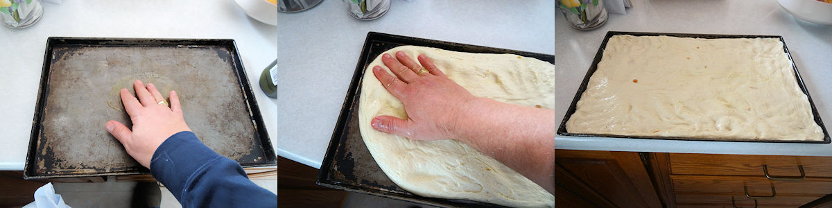 Grease a baking sheet with olive oil. Turn the dough onto it and press it out to the edges. If the dough shrinks back, let it sit for 10 minutes and press out again.