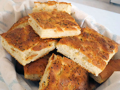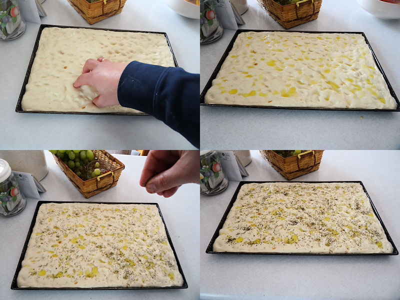 Brush the surface with olive oil. Cut the Focaccia into squares for serving.