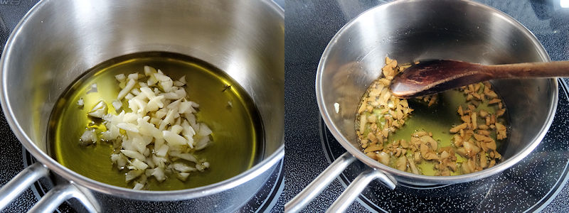 - Put the 25 ml (2 tablespoons) olive oil and garlic in a small pot. Put over medium high heat and cook until the garlic is just golden. Do not brown the garlic. Remove from heat and let cool.