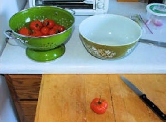 I started by blanching some tomatoes in hot water for one minute and then rinsing them in cold water. Then, I cut the stem core out and chopped them in large chunks. I ended up with about 500 ml (2 cups) of chopped tomatoes.