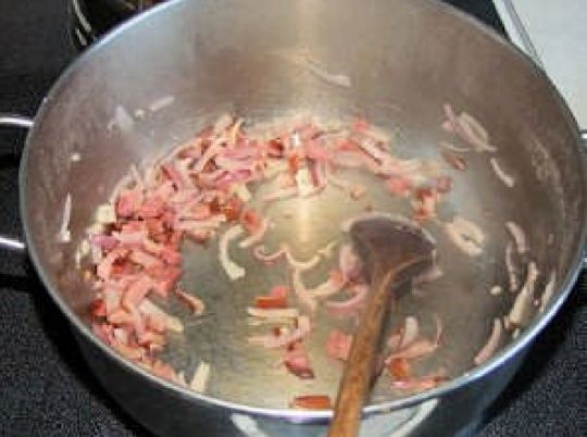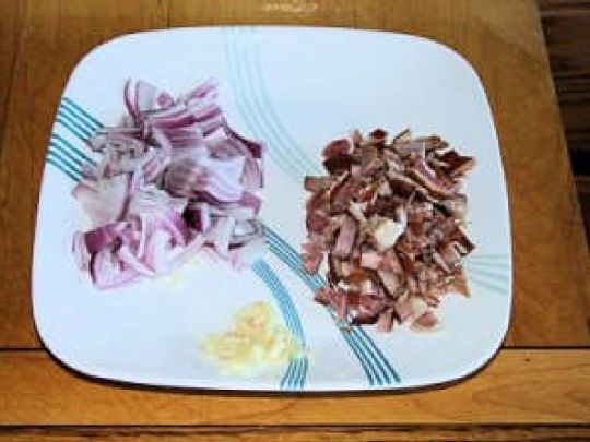 I chopped up about 250 ml (1 cup) of onions, 1 clove of garlic and about 175 ml (3/4 cup) of trimmings from my homemade back bacon. You could use regular bacon I guess, if you must.