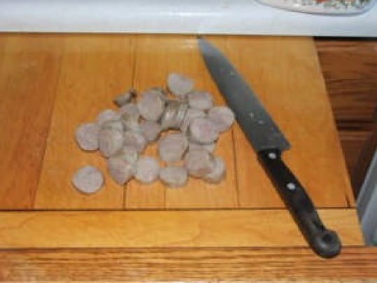 I microwaved some homemade fresh garlic sausage. If you haven’t made your own garlic sausage (poor devil), you can substitute polish or garlic sausage and you won’t have to precook it. Cut it in bite size slices. You want about 375 ml (1 1/2 cups) of sausage.