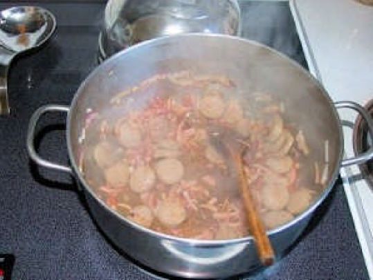 I added the sausage and sauteed for 2 more minutes. You’ll note the pot starts to get brown stuff stuck to the bottom. That is just what you want!