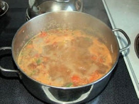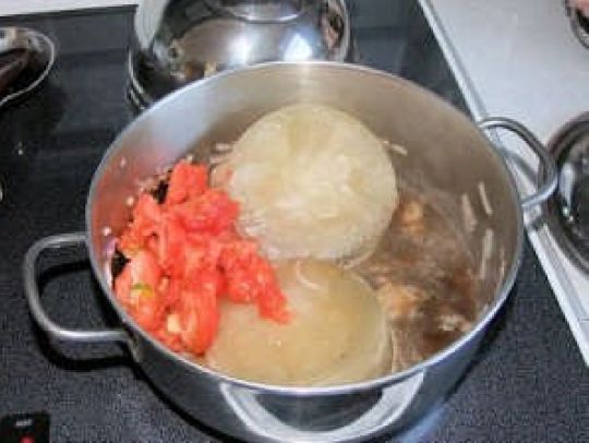 At this point you need to add 3 liters (6 cups) chicken stock. Now, my chicken stock was homemade (whose isn’t) but it was in the freezer. I microwaved one container to get it liquid and threw the others in frozen. I added the tomatoes. You can use canned or packaged stock if you are underprivileged and don’t have homemade.