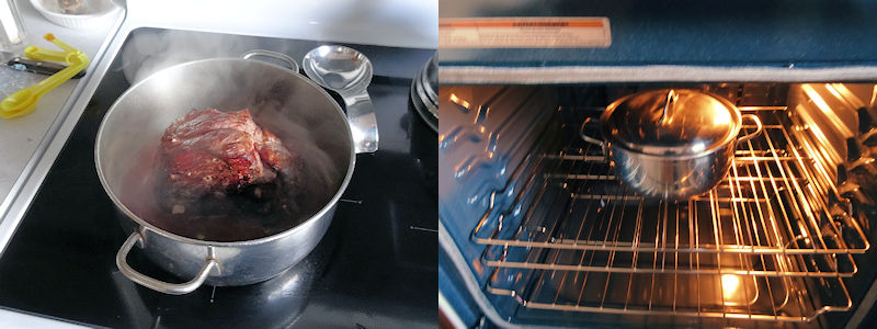 Put the meat in the Dutch Oven and bring the liquid to a boil. Put the Dutch oven in a preheated 325 F oven and cook it for 1 hour 45 minutes.