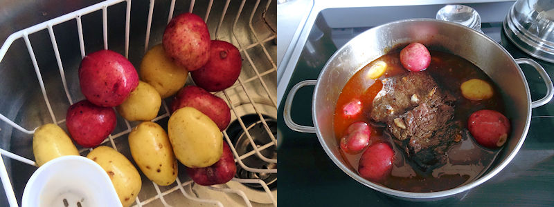While the roast is cooking, clean 6 medium soft skinned potatoes. After the 1 hour and 45 minutes has finished, put the potatoes into the liquid around the roast.