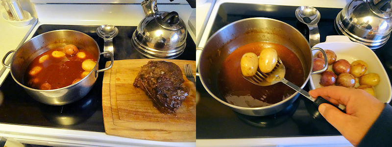Take the meat and potatoes out of the liquid. Put the potatoes in the oven to keep warm and let the meat rest on the cutting board.