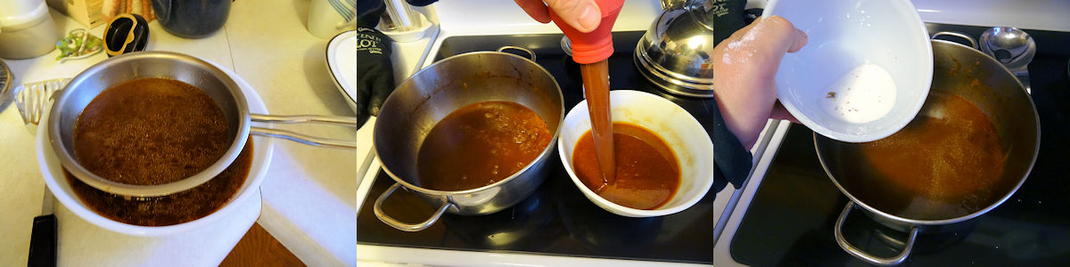 Strain the liquid and defat it by using a turkey baster to pull the liquid from under the fat. Put the liquid and the onions from the strainer back in the Dutch oven over medium heat.