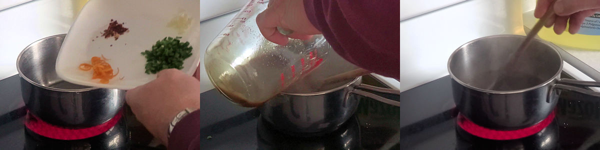 - Heat the 8 ml (1 1/2 tsp) vegetable oil in a small saucepan over medium heat. Add the green onion, garlic, chillies and orange zest. Sauté, stirring, until there is a strong smell from the seasonings, a few seconds.