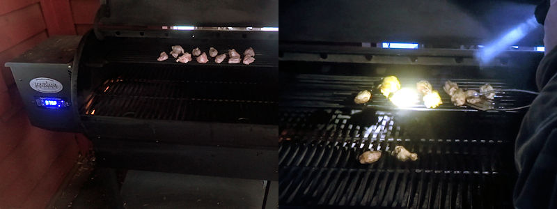 I preheated my smoker to 375 F. You could also cook these in a 375 F oven on a foil lined tray.