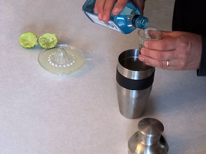 I half filled my cocktail shaker with ice and added 75 ml (2 1/2 ounces) of gin, 15 ml (1/2 ounce) lime juice and 15 ml (1/2 ounce) simple syrup.