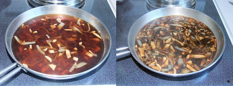 Add the beef stock to the onions and mushrooms. Increase the heat to bring to a boil. Reduce the heat and simmer for 10 minutes. add the soy sauce, Worcestershire, sherry and balsamic vinegar.