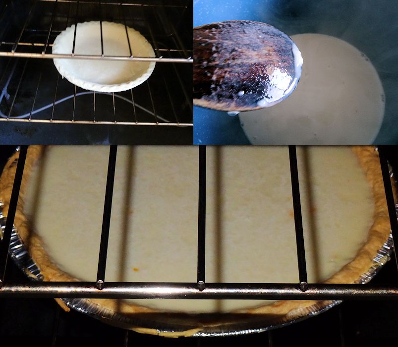 Put the unbaked pie crust in a preheated 400 F oven. Put the saucepan on medium low heat and stir until the mixture at the bottom of the sauce pan just starts to pick up on the spoon as you stir. Pour the filling into the hot pie crust. If there is any filling left, you can put it in an oven proof bowl and put it in the oven with the pie. Reduce the oven temperature to 375 F.