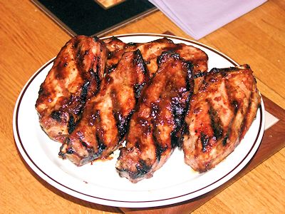 I shook a generous amount of the seasoning on the chops and threw them on the barbecue preheated to medium. I cooked them for 15 minutes to an internal temperature of 155 F, brushing 4 times with a thin layer of the steak sauce.