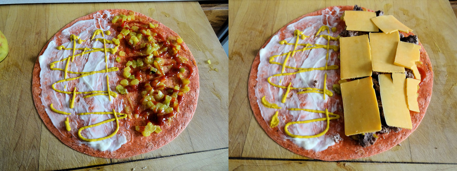 I crumbled 1/4 pound of cold cooked hamburger over relish side and covered with thin slices of cheddar.