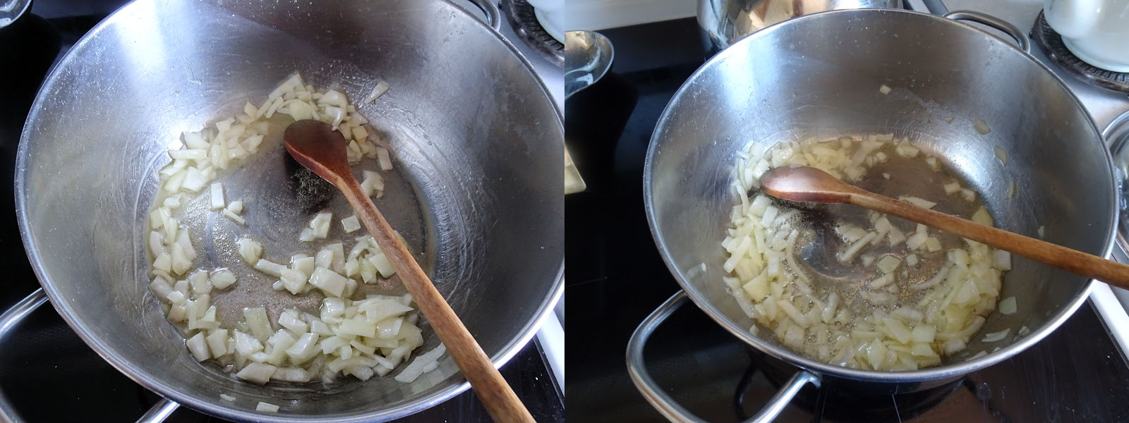 I melted 25 ml (2 tbsp) of butter over medium high heat in a saucepan. I added 1/2 cup (125 ml) of chopped onion and sauteed until the onion was getting soft.